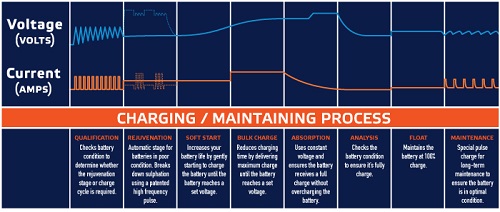 Patented battery rejuvenation technology: The charger has a unique and patented rejuvenation feature which uses high voltage equalising and peak pulse reconditioning to repair sulphated batteries. This feature is fully automatic and depends on the internal impedance of the battery.